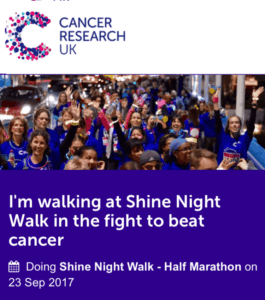 On Saturday 23rd September I will be doing the Cancer Research Shine walk Half Marathon and walking 13 Miles along the streets of London on a dedicated route, with my husband, brother in law and sister in law.